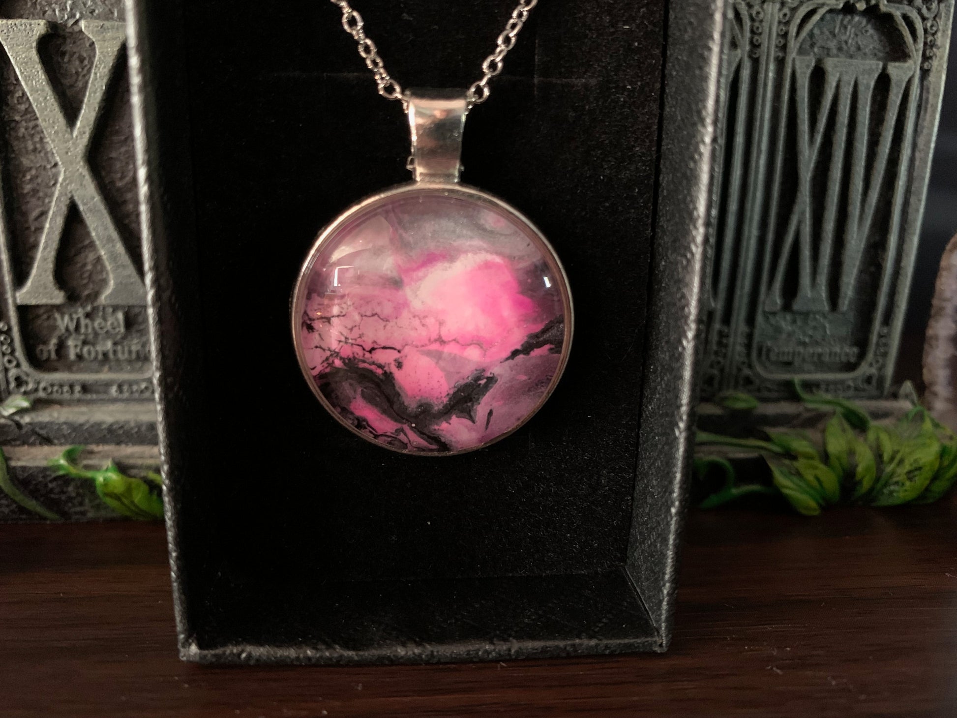 These are acrylic paint based designs, carefully selected for their intricate detail and evocative colour combinations. Each one is housed in a metal alloy case, glass cabochon and matching chain. These are the perfect piece of costume jewellery and make excellent gift items.