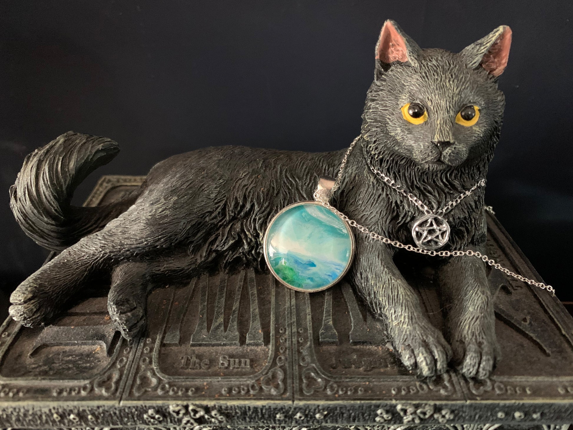 These are acrylic paint based designs, carefully selected for their intricate detail and evocative colour combinations. Each one is housed in a metal alloy case, glass cabochon and matching chain. These are the perfect piece of costume jewellery and make excellent gift items.