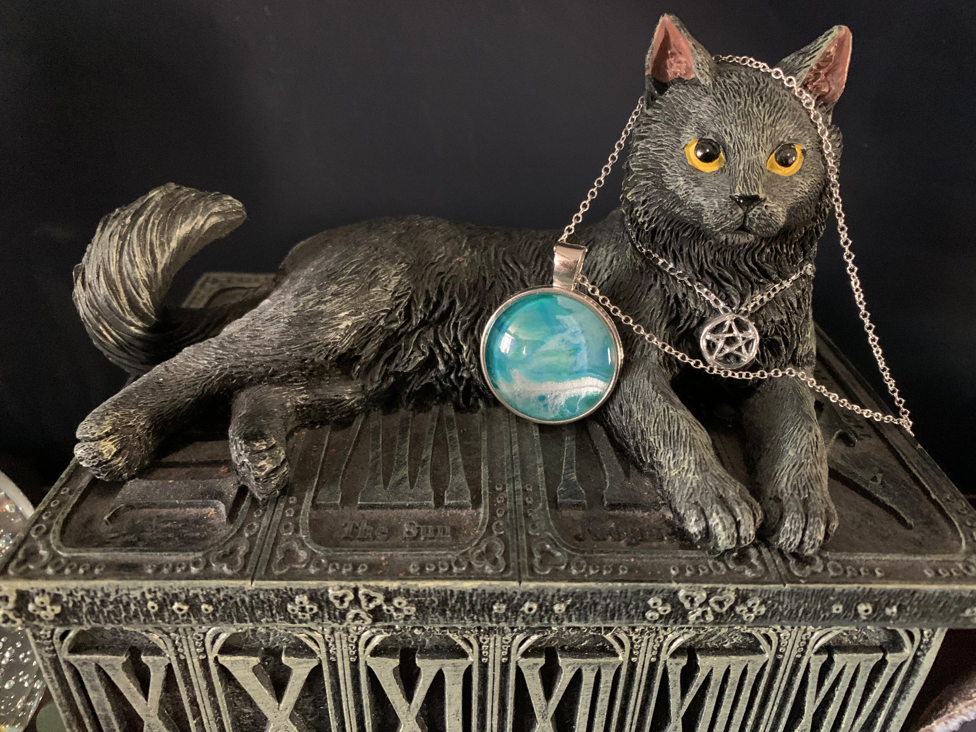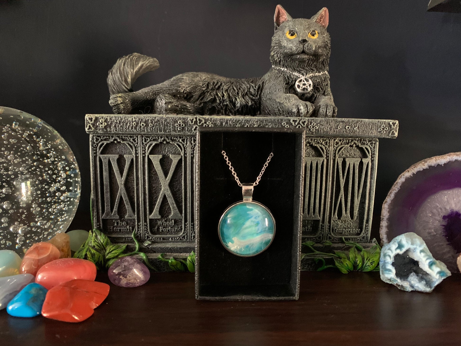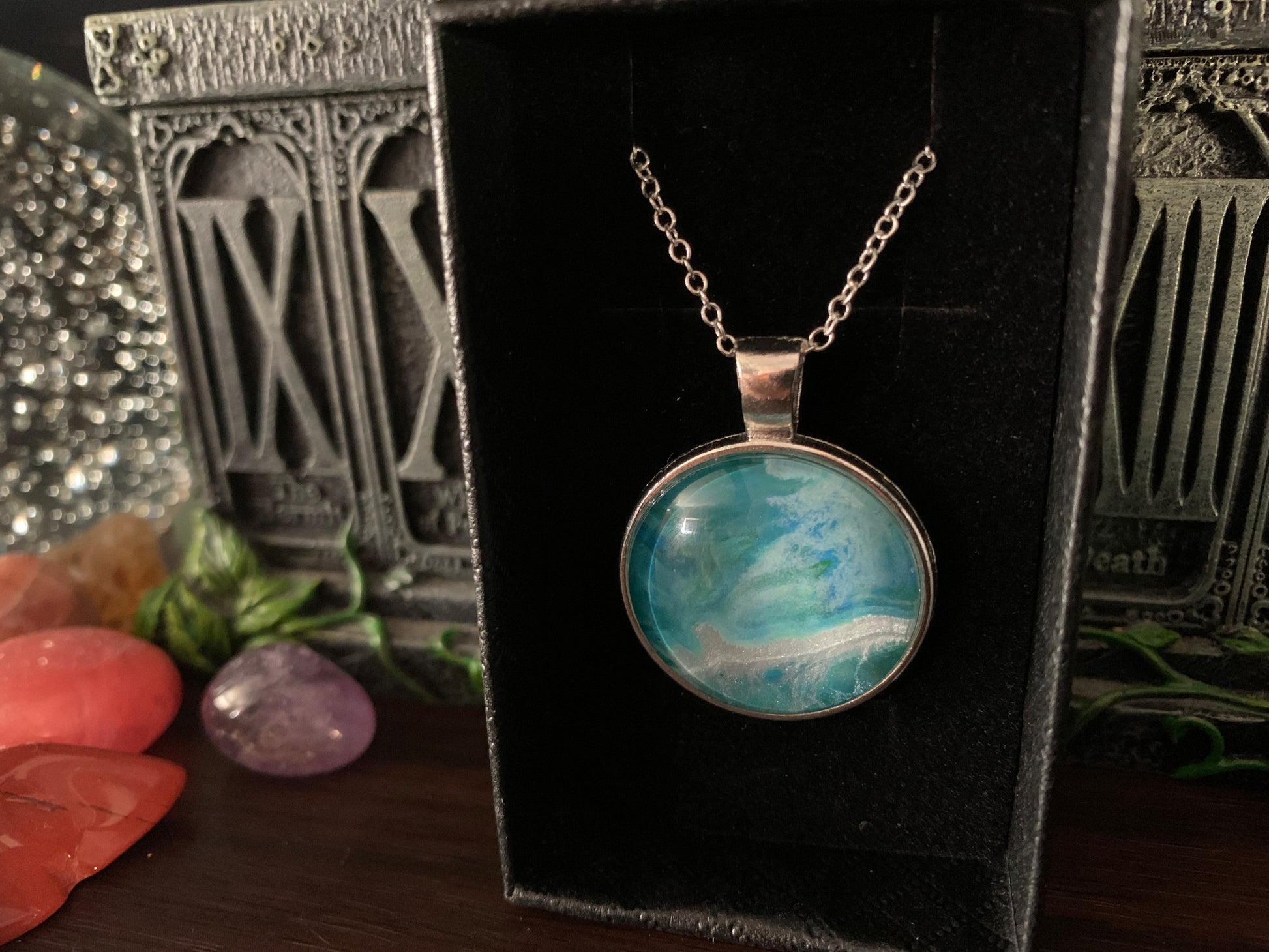 These are acrylic paint based designs, carefully selected for their intricate detail and evocative colour combinations. Each one is housed in a metal alloy case, glass cabochon and matching chain. These are the perfect piece of costume jewellery and make excellent gift items.