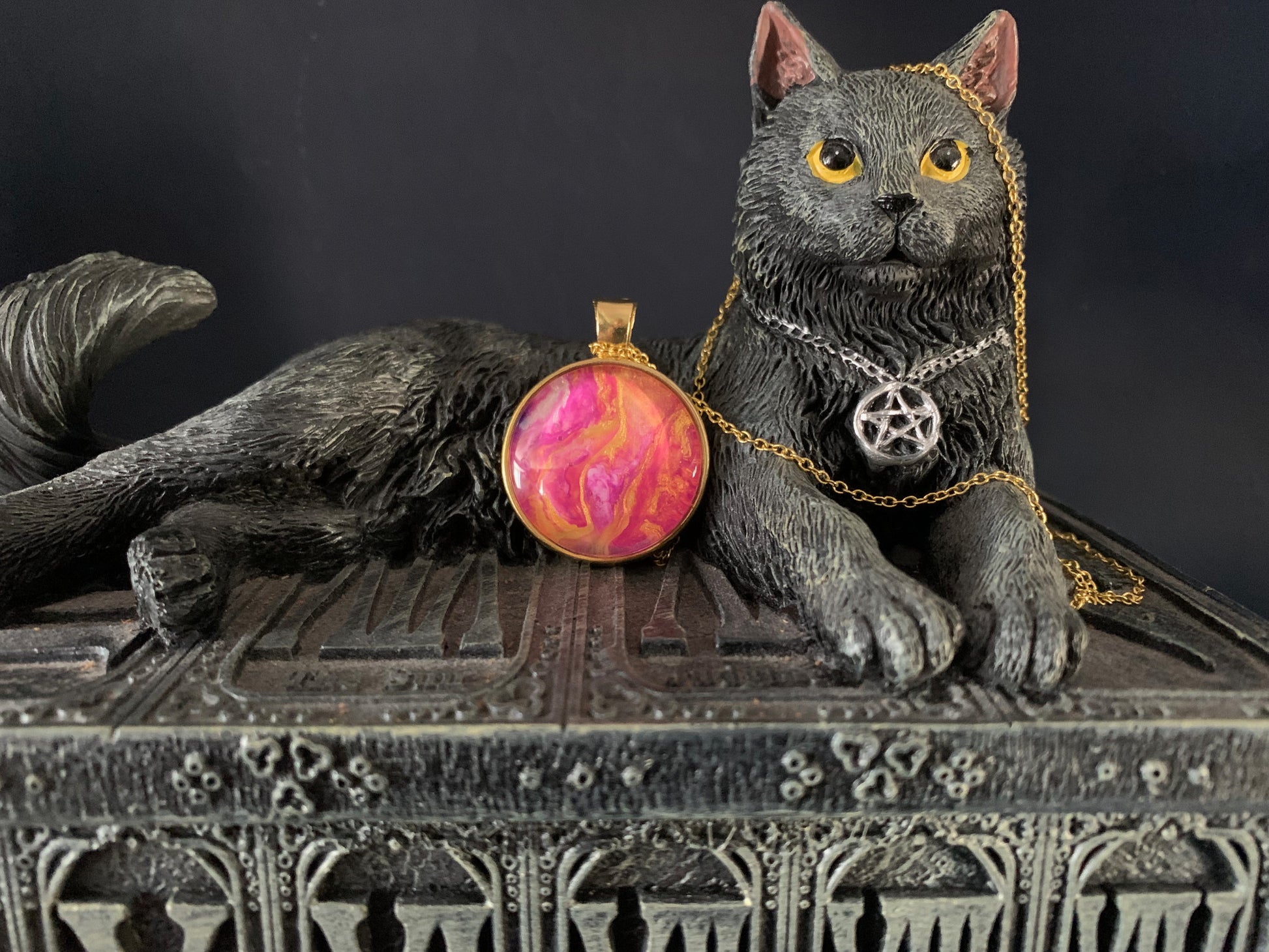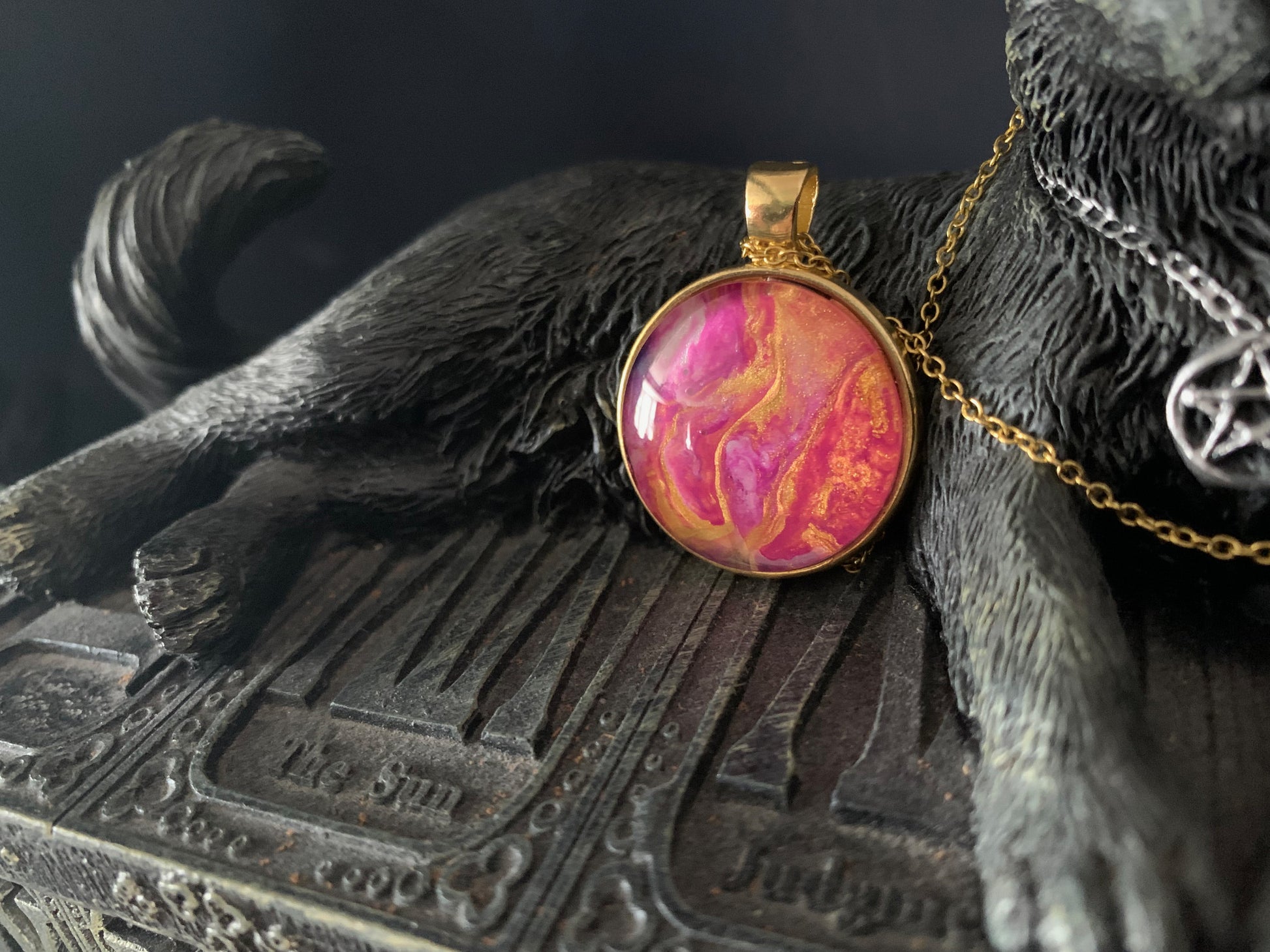 These are acrylic paint based designs, carefully selected for their intricate detail and evocative colour combinations. Each one is housed in a metal alloy case, glass cabochon and matching chain. These are the perfect piece of costume jewellery and make excellent gift items.