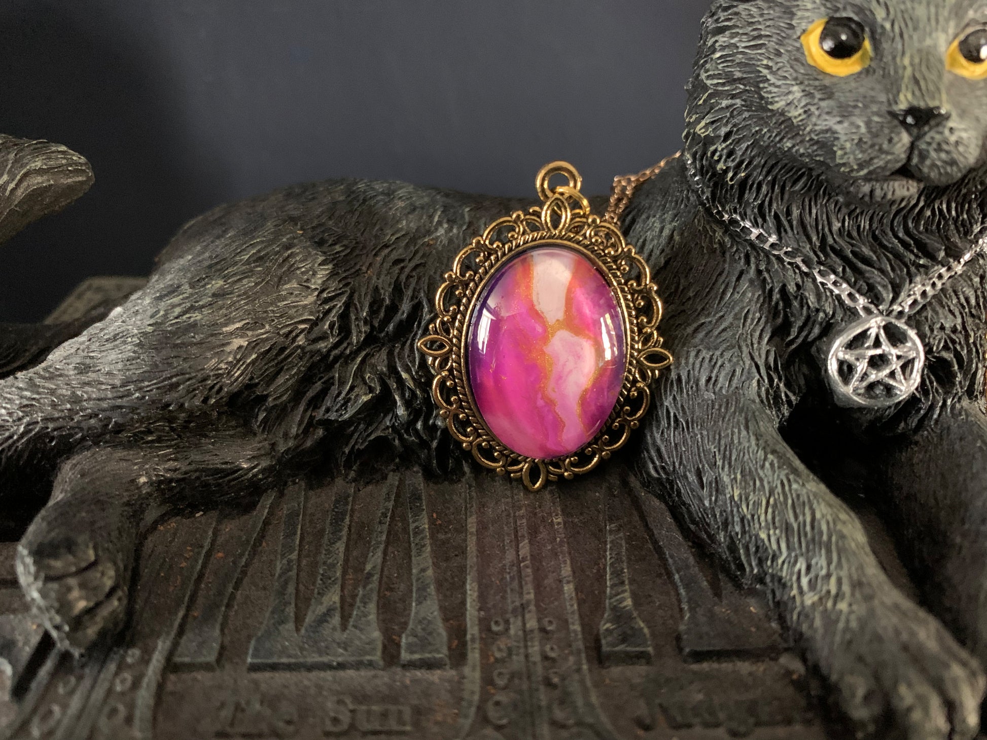 These are acrylic paint based designs, carefully selected for their intricate detail and evocative colour combinations. Each one is housed in a metal alloy case, glass cabochon and matching chain. These are the perfect piece of costume jewellery and make excellent gift items.