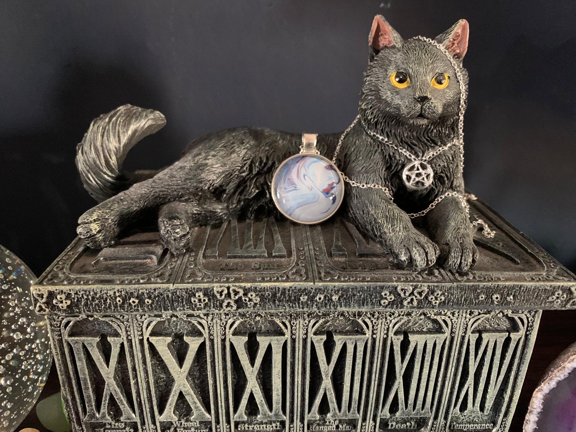 These are acrylic paint based designs, carefully selected for their intricate detail and evocative colour combinations. Each one is housed in a metal alloy case, glass cabochon and matching chain. These are the perfect piece of costume jewellery and make excellent gift items.