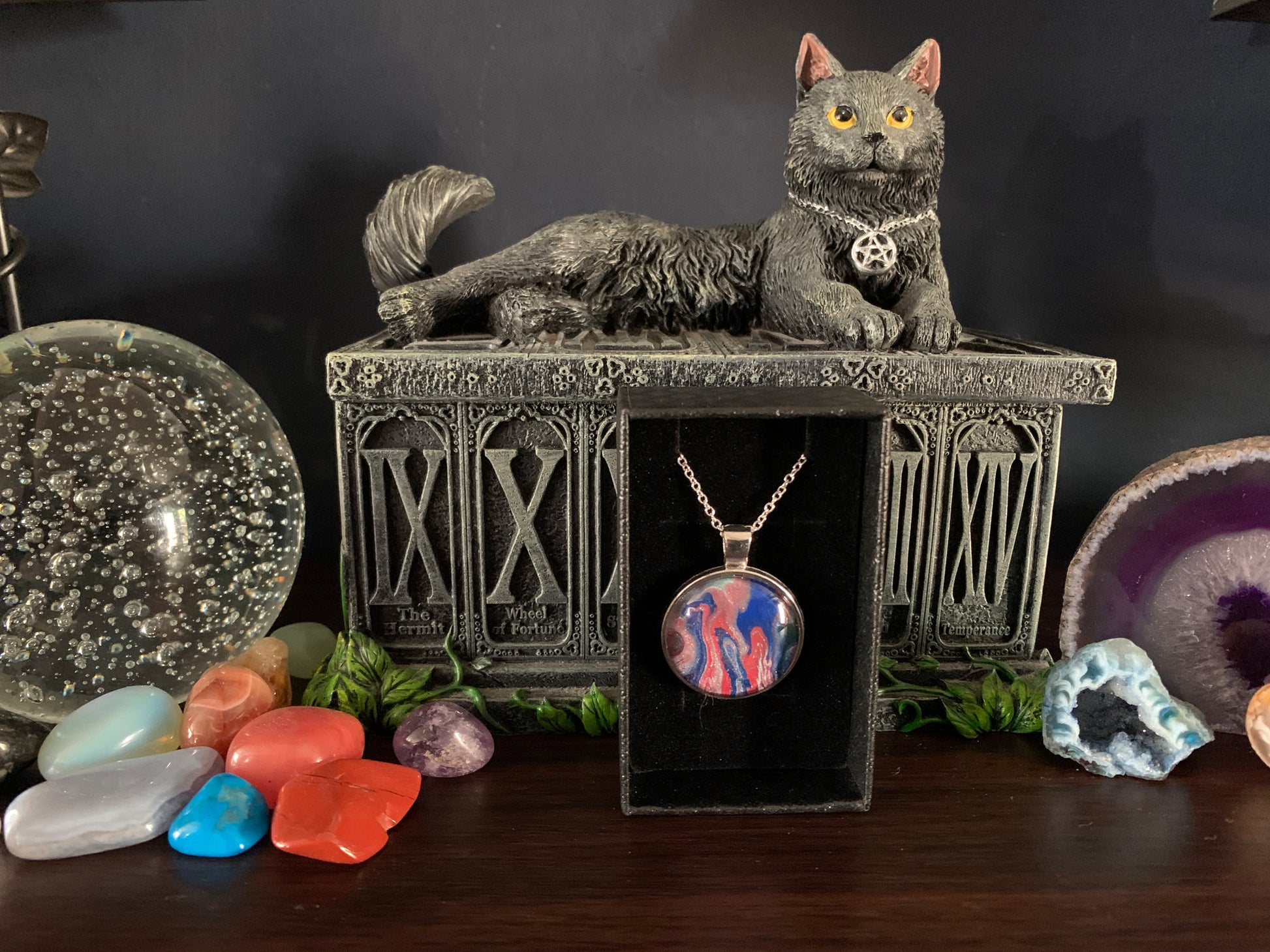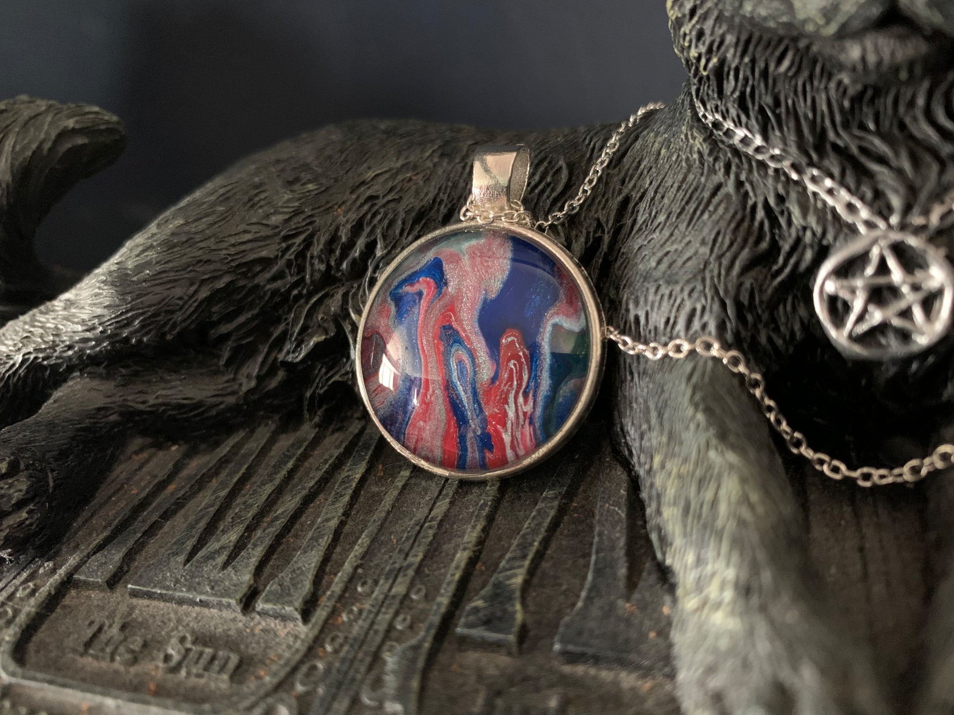 These are acrylic paint based designs, carefully selected for their intricate detail and evocative colour combinations. Each one is housed in a metal alloy case, glass cabochon and matching chain. These are the perfect piece of costume jewellery and make excellent gift items.