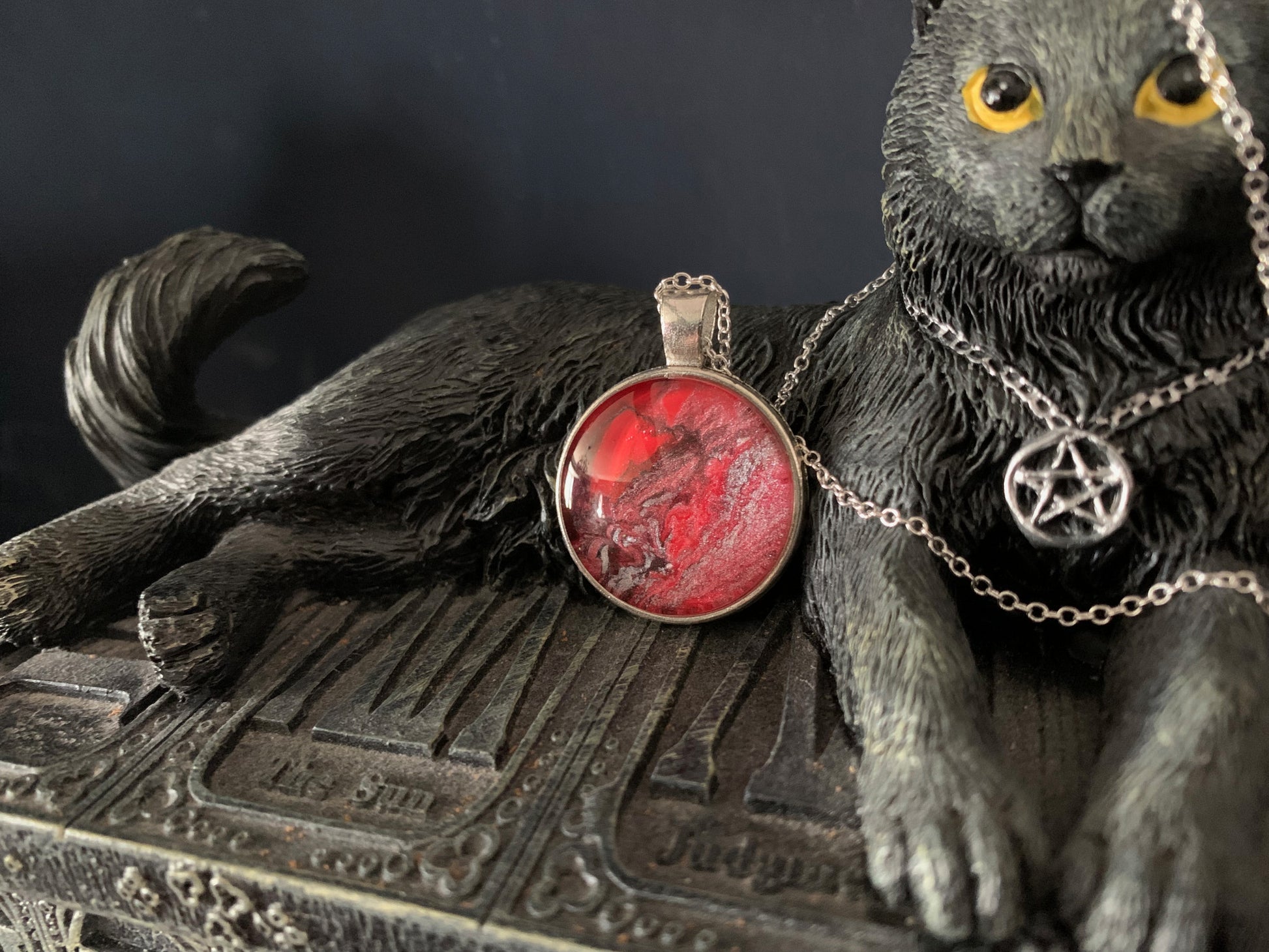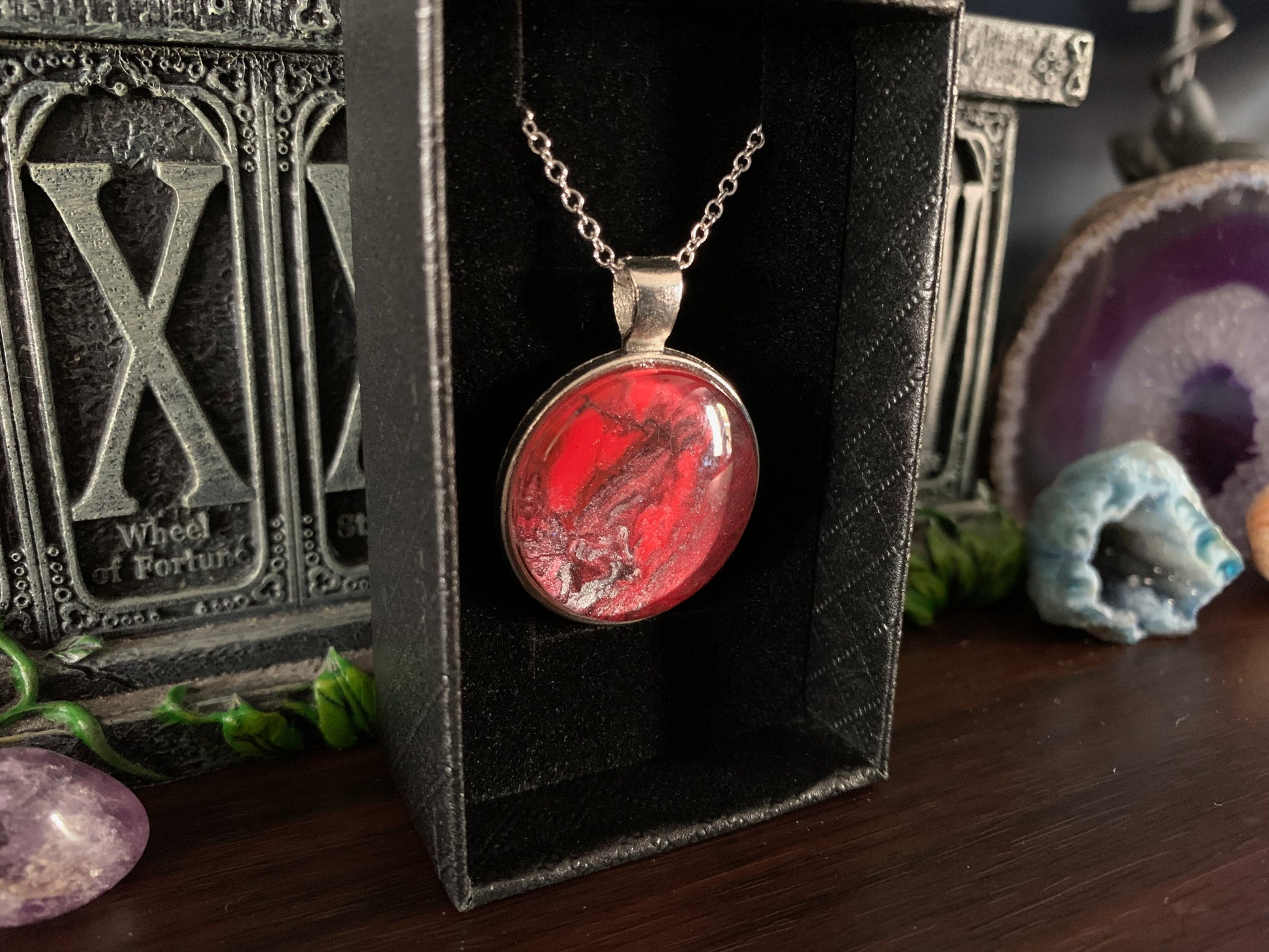 These are acrylic paint based designs, carefully selected for their intricate detail and evocative colour combinations. Each one is housed in a metal alloy case, glass cabochon and matching chain. These are the perfect piece of costume jewellery and make excellent gift items.