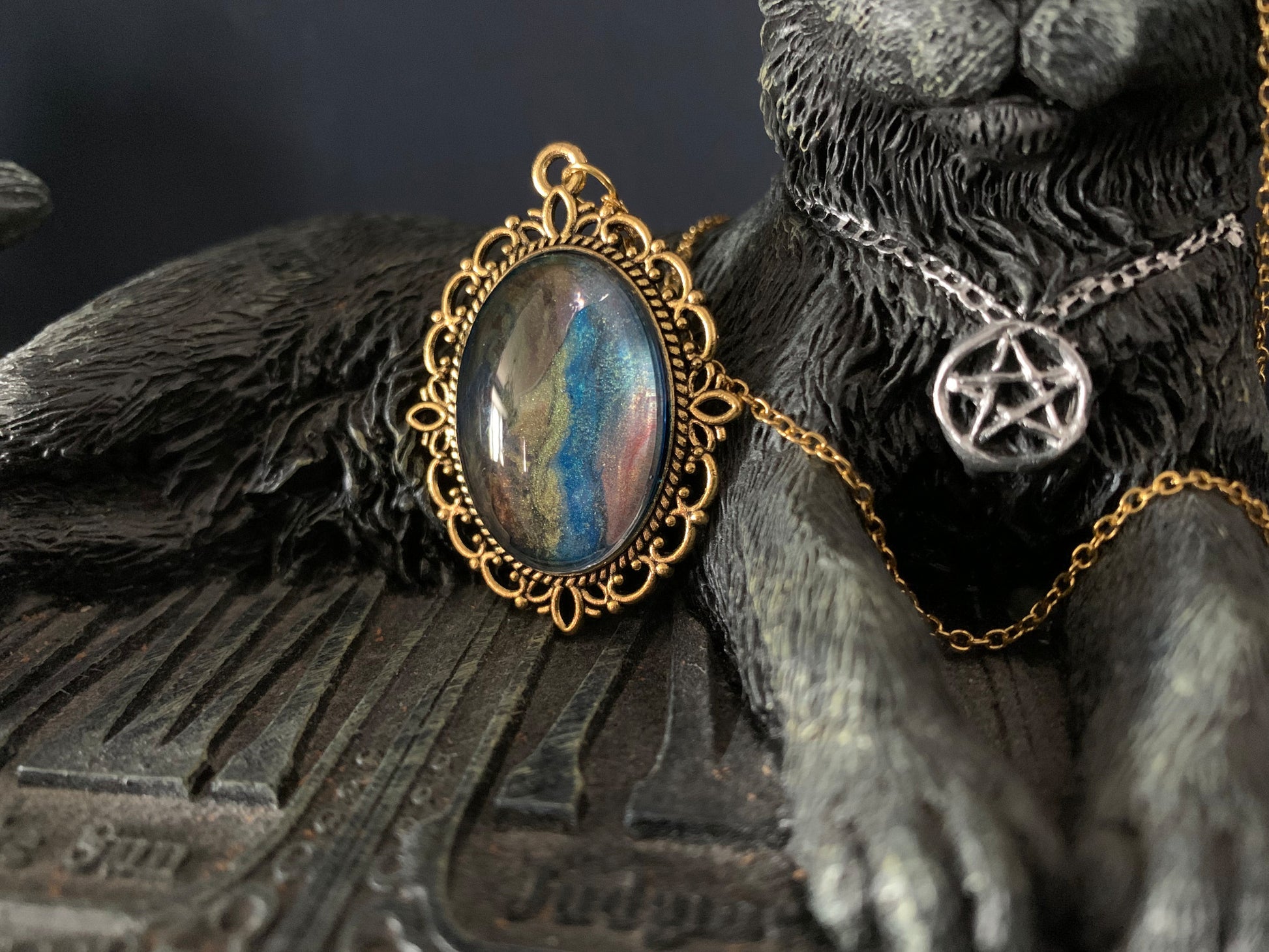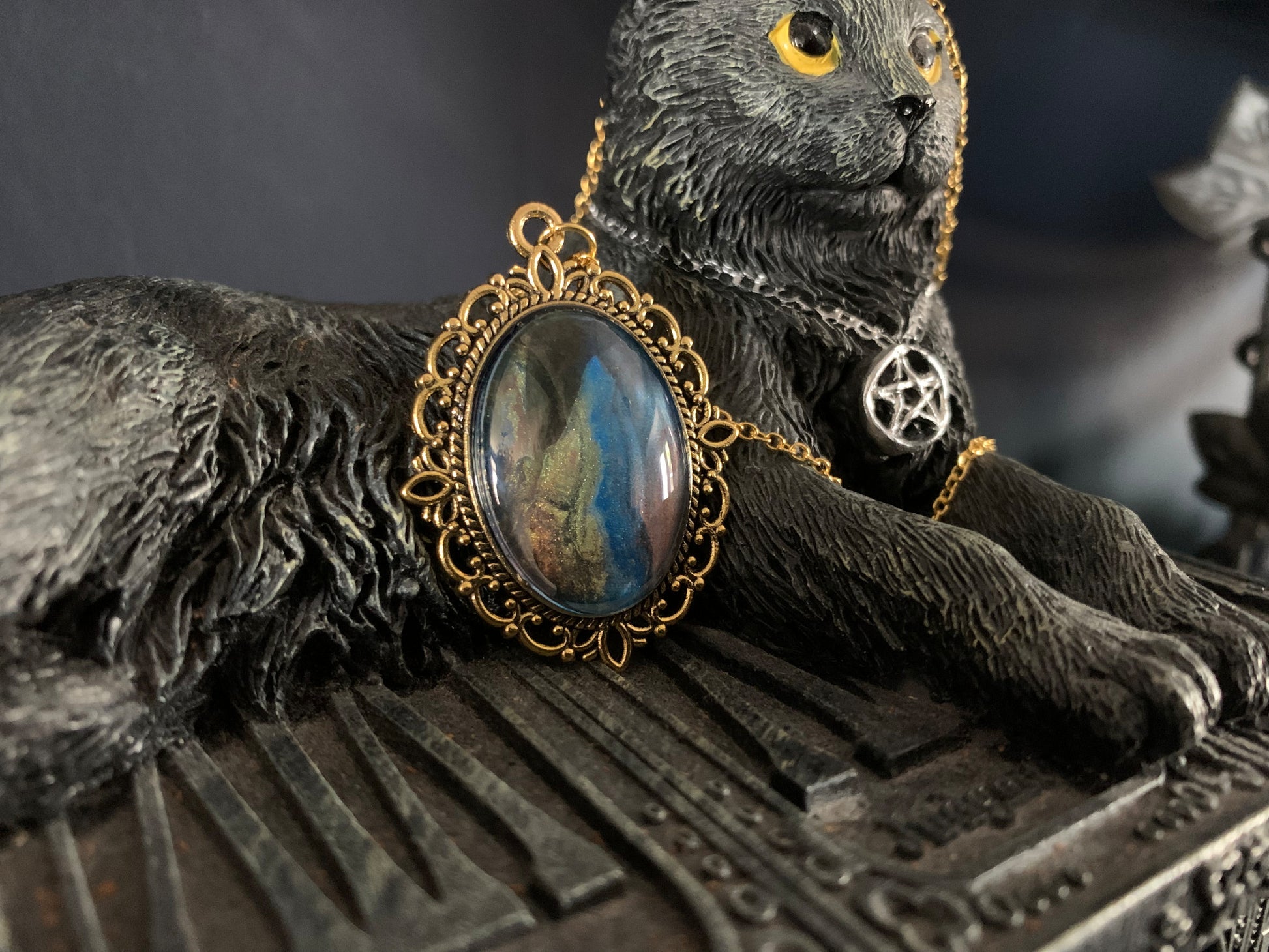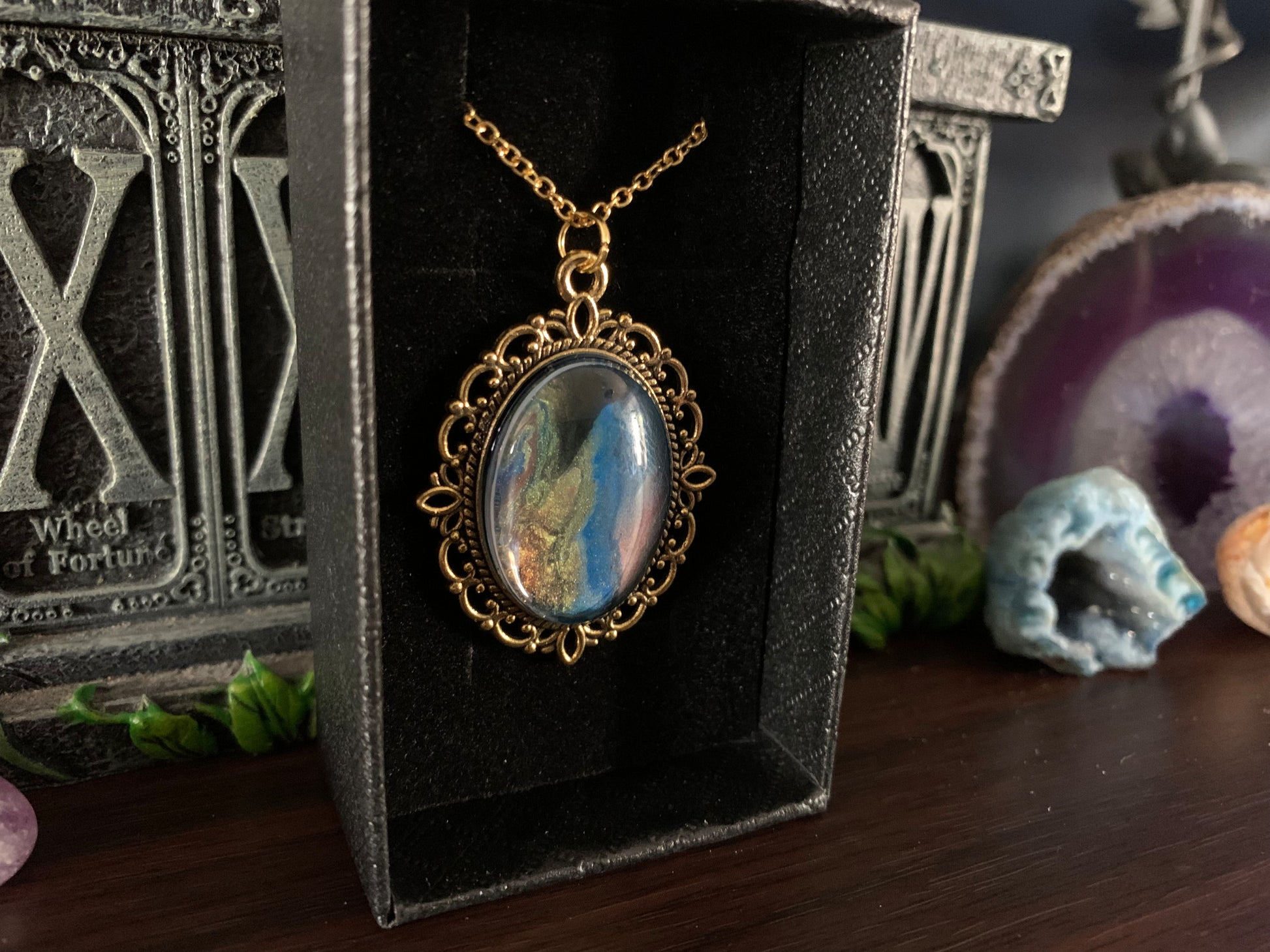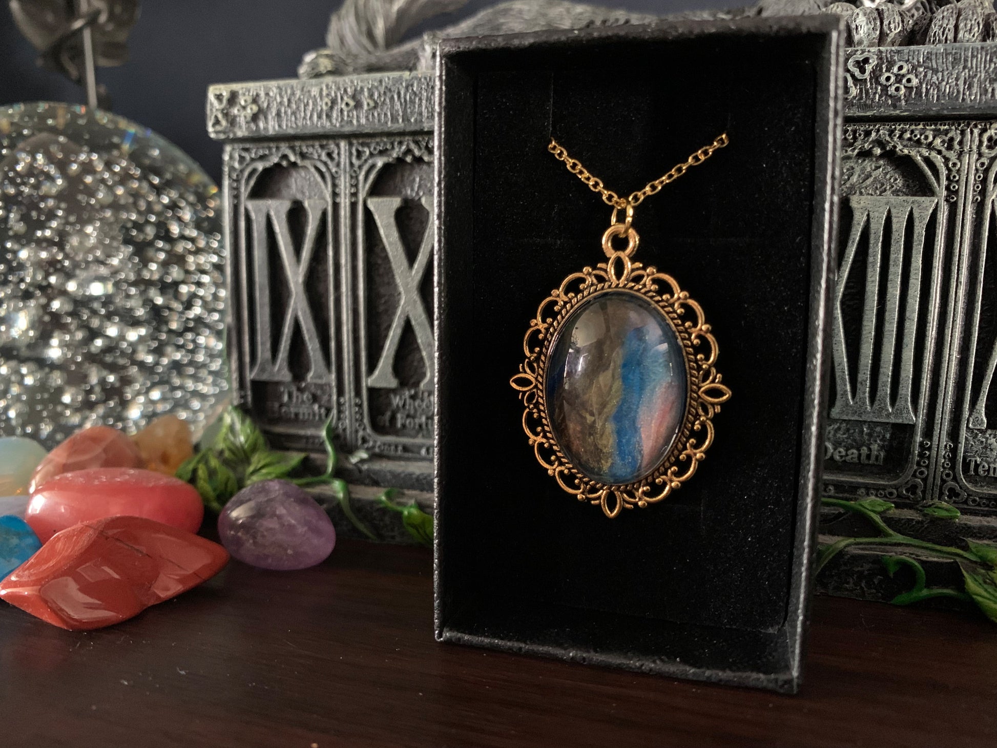 These are acrylic paint based designs, carefully selected for their intricate detail and evocative colour combinations. Each one is housed in a metal alloy case, glass cabochon and matching chain. These are the perfect piece of costume jewellery and make excellent gift items.